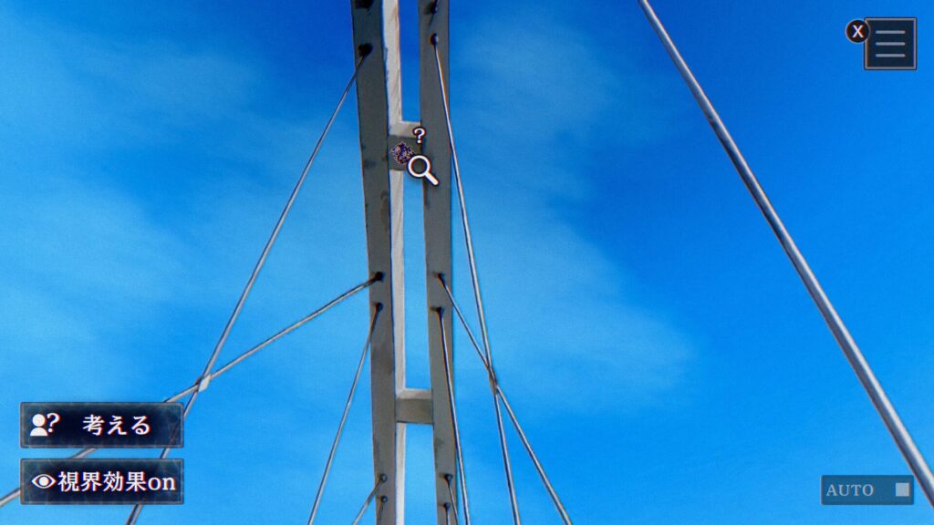 志貴結命子シナリオ『麻生の浦大橋の調査』にて、最初の始点から後ろを向いて真上を見上げることで発見することができました。