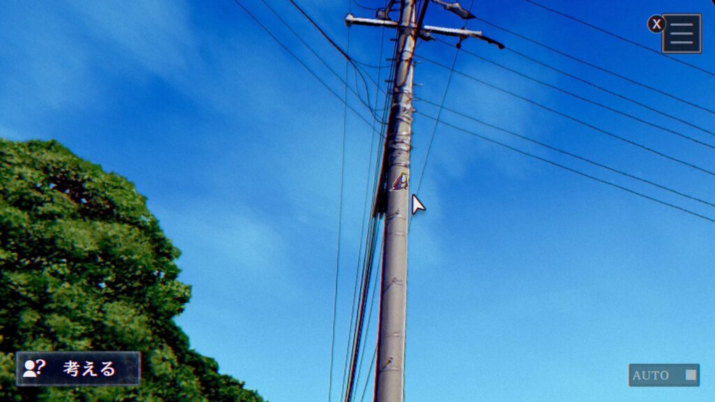 アルナーヴ・バーナムシナリオ『伊勢湾の人魚巡り』の『安濃町から』にて、最初の視点で後ろを振り向いたところにある電柱の上の方に貼られています。