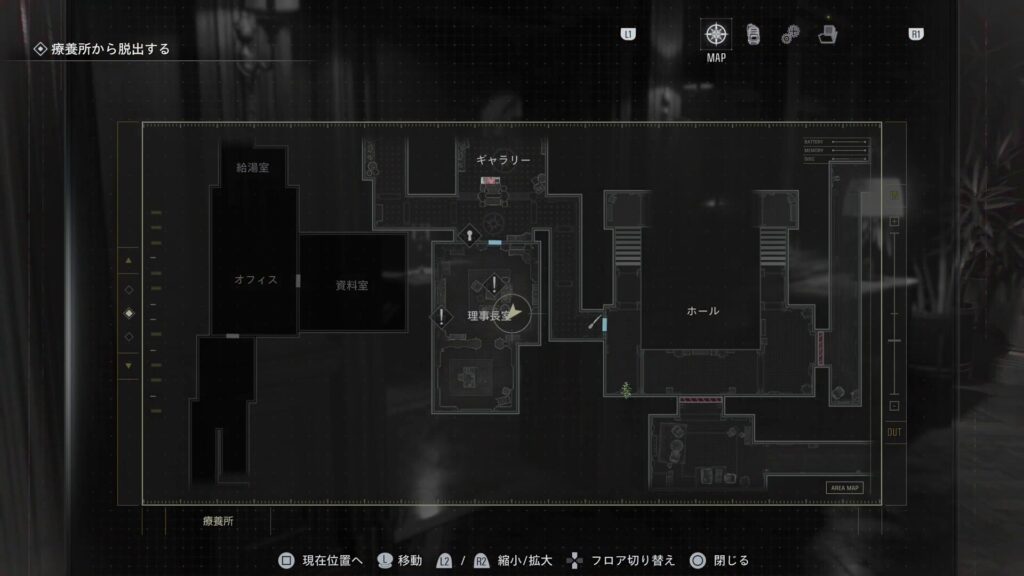 療養所西館、入ってすぐのプレイルームの入り口となるくぼみのある扉を開くには、赤い宝石が必要となります。