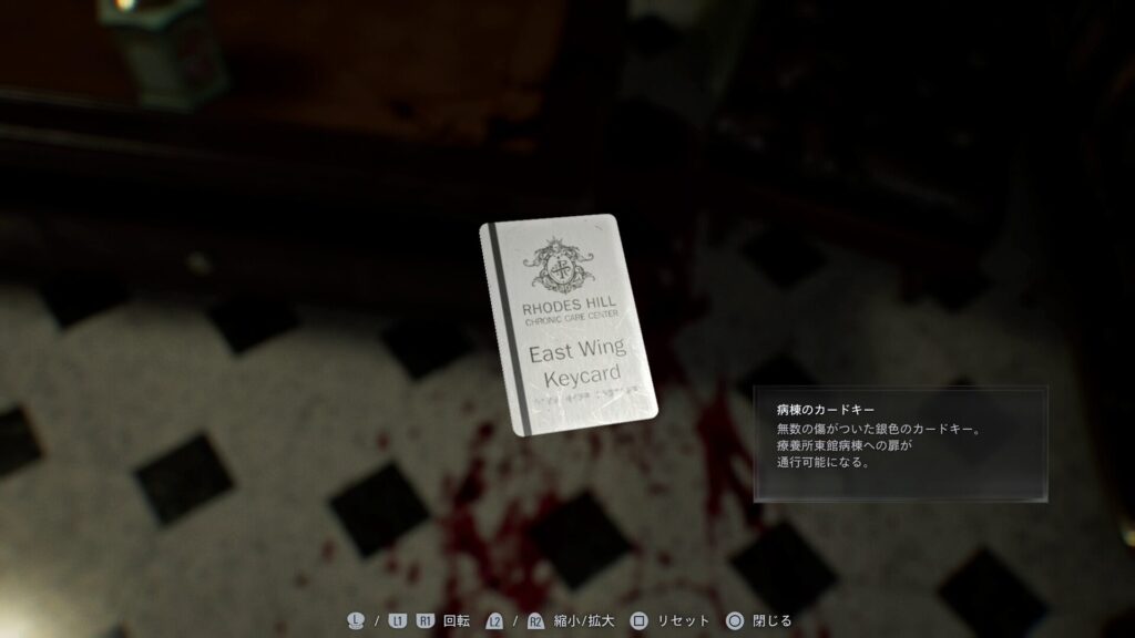 プレイルーム内では、転がっている手から、病棟のカードキーが入手可能。東病棟側のカードキーとなっており、反対側の探索が可能になります。