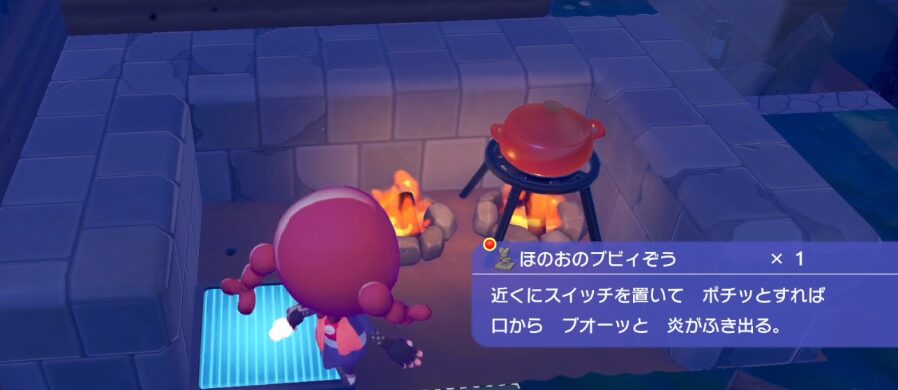 ほのおのブビィぞうは、近くにスイッチを置いて推すことで口から炎を吐き、正面にある着火するオブジェクトを燃やすことができます。そのため、火を噴くポケモンの代わりとして使用することができます。