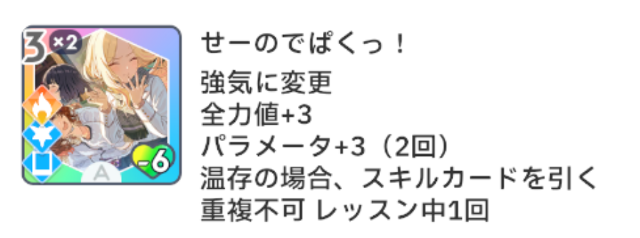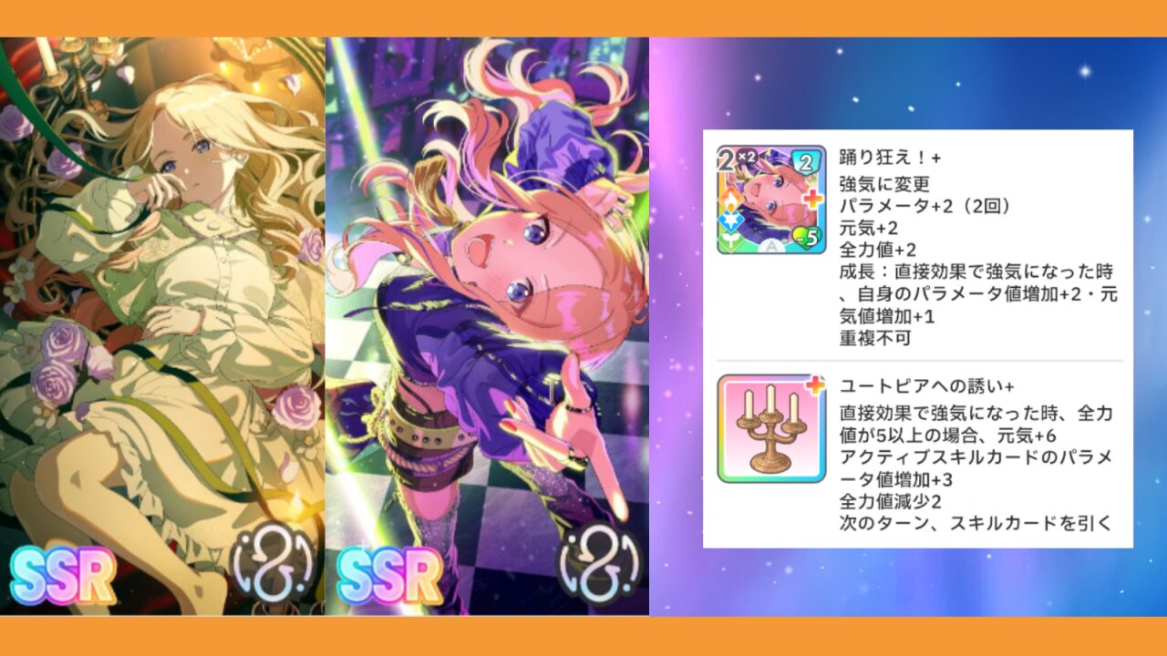 スキルカード『踊り狂え』は、未強化の状態ではパラメータ+2の回数が1回になります。Pアイテム『ユートピアへの誘い』は、未強化では元気+4となっているようです。