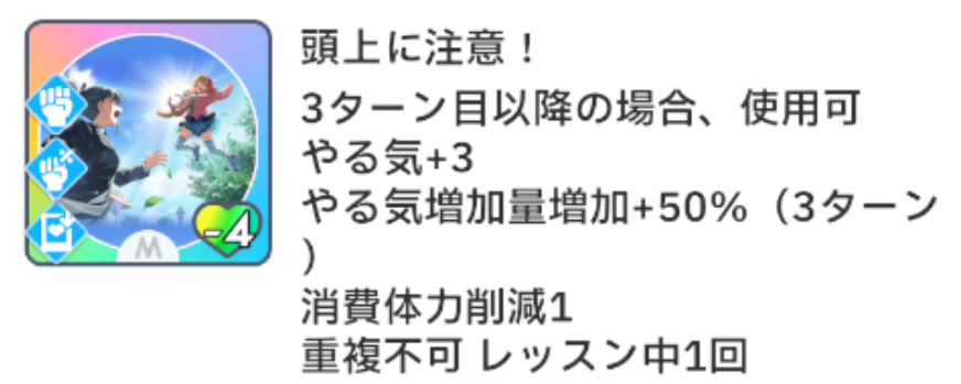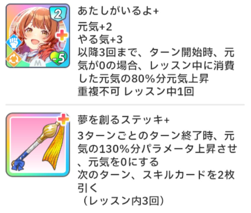スキルカード『あたしがいるよ+』は、元気+2、やる気+3に、以降3回まで、ターン開始時、元気が0の場合、レッスン中に消費した元気の80%分元気上昇の効果。未強化では、体力コストが-6やる気+1となるようです。