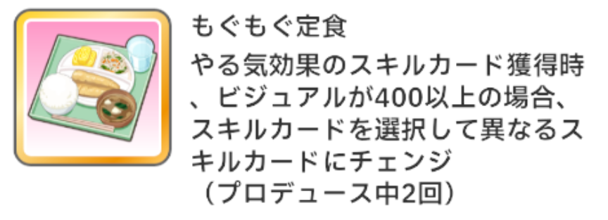 Pアイテム『夢を創るステッキ+』は、3ターンごとのターン終了時、元気の130%分パラメータ上昇させ、元気を0にする。次のターン、スキルカードを2枚引く効果がレッスン中3回発動。未強化の場合、元気の110%分のパラメータ上昇、スキルカードを引く枚数が1枚となるようです。