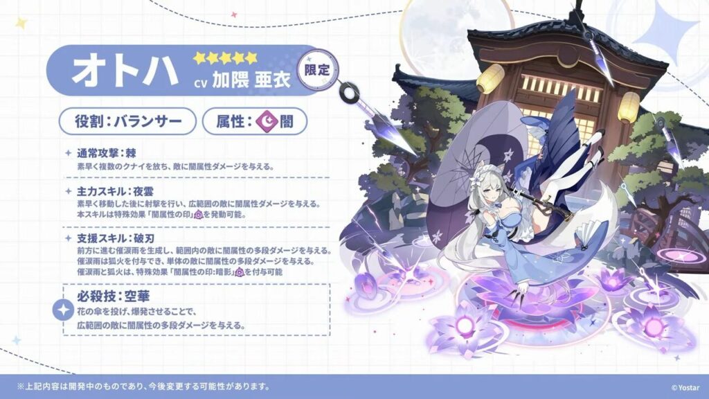 オトハは、闇属性のバランサーとして実装。動画では実際にオトハを操作しているところも紹介されていました。ラール(聖夜)に続く、限定ガチャでの実装となるようです。