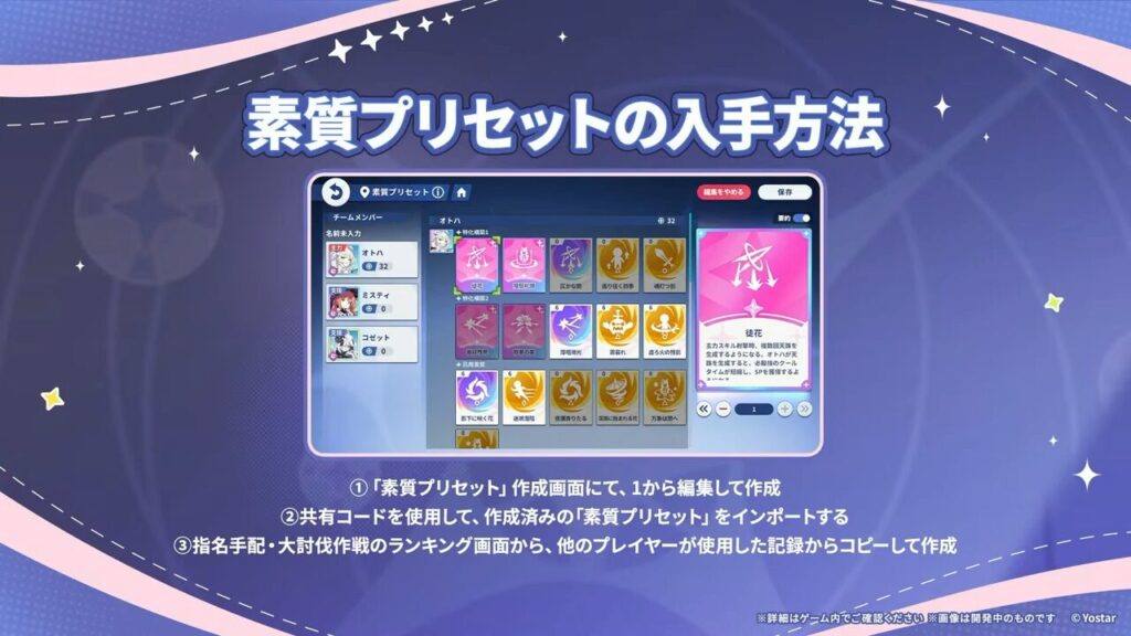 素質プリセット機能は、手動での変更に加え、他プレイヤーの共有コードを使用しての設定、締め手配や大討伐作戦のランキング画面から、他プレイヤーが使用した記録をコピーすることも可能。