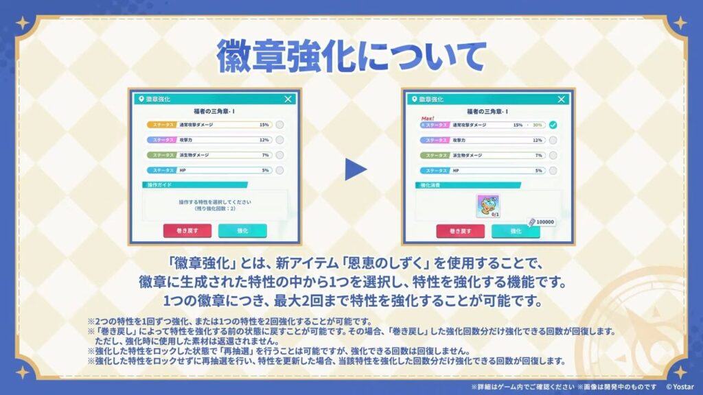徽章強化機能が新たに実装、新アイテム『恩恵のしずく』を追加することで、徽章に生成された特性の中から1つ選択肢強化可能。1つの徽章につき、最大2回まで特性が強化可能とのことです。