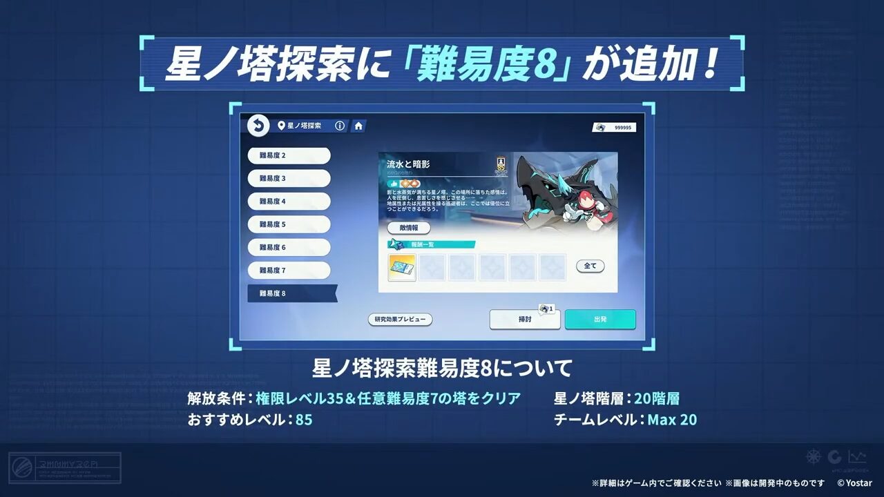 星ノ塔に新たな探索難易度8が追加。これまでの最高難易度7の星ノ塔クリア、特権レベル35の解放などの条件をた制することで新たな難易度に挑戦可能となるようです。
