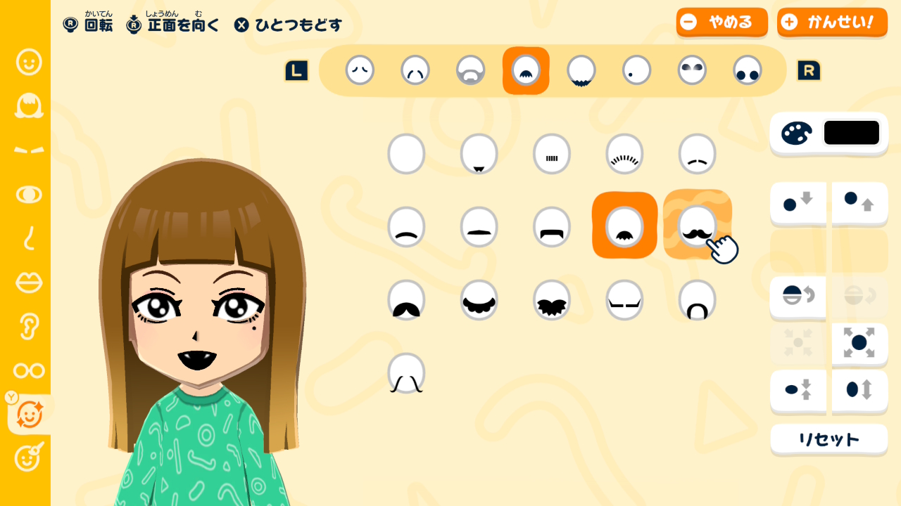 本作はSwitchのタッチパネルを使ってフェイスペイントを描くことが可能。デフォルトのパーツだけでも色々再現できますが、フェイスペイントが使えるとよりこだわることも可能です。