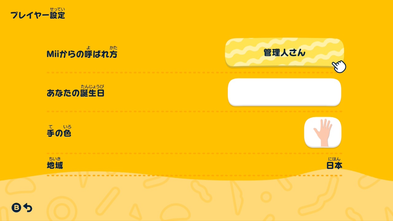 Miiからの呼ばれ方や、誕生日、手の色、地域といった項目の変更が可能となっています。